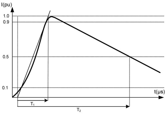 The lightning waveform as per Figure 1 is characterized by a rise time T1 which corresponds to the time till peak current and decay time T2 which is the time till the current gets 50% of its peak value.