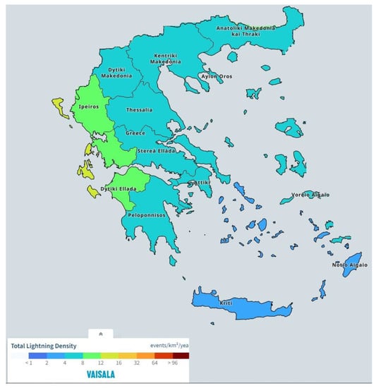 - Galanaki, E.; Kotroni, V.; Lagouvardos, K.; Argiriou, A. A ten-year analysis of cloud-to-ground lightning activity over the Eastern Mediterranean region. Atmospheric Res. 2015, 166, 213–222. [Google Scholar] [CrossRef]