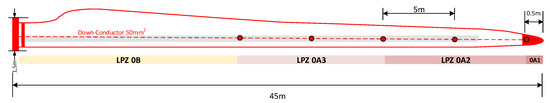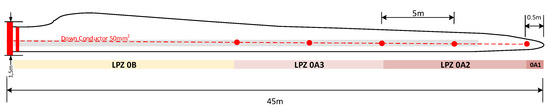 The current lightning protection system of wind turbines is a proposal that utilizes the aforementioned methodology with basic protection that is compatible with the IEC61400-24 provisions and add-ons that achieve safe and reliable protection that is adapted to the area-specific conditions. This system ensures the presence of a basic and standard design with the highest protection level based on IEC61400-24, achieving a predefined cost that can then be further improved to meet the local lightning conditions. The basic lightning protection system consists of either lightning receptors placed along the blade length or lightning conductors placed on the blade surface or inside the blade. The main aim of this system is to divert the lightning current from the attachment point to the nacelle in such way that any arcs inside the blade or between the blade root and hub is avoided. The specific LPS is based on a blade of 45 m in length, type D, as per [1], and the tip height is ~125 m higher than the wind turbine installation altitude is. The site altitude is around 900 m asl. The blade is made of fiberglass (GRP), allowing it to withstand the mechanical load and it has a lighter weight. The blade is split into two shells wrapped around a balancing support beam. The blade should have such a design that allows it to be aerodynamically efficient at capturing as much as kinetic energy from the wind as possible. To protect the blade from lightning discharges, discrete air terminations have been installed according to IEC TR 61400-24 [1]. These receptors are installed on both sides of the blade from a radius of 20 m to the tip region, with a spacing of 5 m, totaling five receptors on each side. The receptors are connected to an inner down conductor, a 50 mm2 copper conductor fixed to the beam with mechanical joints. At the root end of the blade, the specific down conductor is connected to the flange, which acts as the electrical interface for the rest of the turbine. The blade design is shown in Figure 7 based on concept A, as per IEC Std. 61400-24:2019, where the blade is split into two basic lightning protection zones with LPZ0A, for it to be split further into three zones. The lightning receptors are placed at a distance of 5 m away from each other, covering half of the blade length, with the first one positioned 50 cm away from tip. LPZ-0A1 is the one that is most exposed to the lightning zone, where high-amplitude lightning is expected to hit with a peak current of up to 200 kA (10/350 μs waveform). LPZ-0A2 is a zone where a current of less than 200 kA (usually the half of peak value) is expected, while LPZ-0A3 is a zone where no direct lightning strike is expected, but still, an induced current can be present in the outer zones with a maximum amplitude of 10 kA. LPZ-0B is a zone in which no direct lightning is expected to hit, but the current from the outer zones is considered as an indirect effect. The standard blade design fulfils the IEC61400-24 provisions, with 98% reliability of it covering most of the cases globally. This percentage means that 98% of all lightning strikes will only cause damage that is acceptable until the next scheduled maintenance and has no influence on the performance of the wind turbine. The wear of some components must be expected over the years (e.g., the receptors in the blades, etc.).