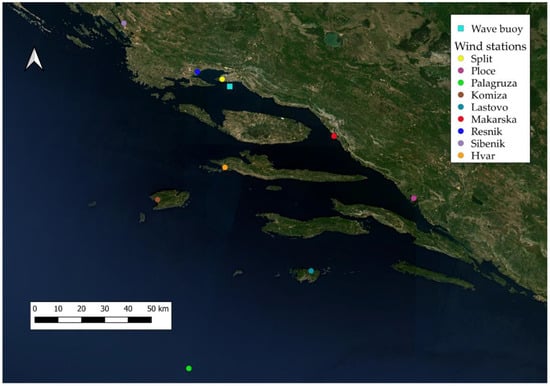Map of the study site on the southern coast of Croatia, showing nine weather stations (circles) and one wave buoy (rectangle), described in detail in Section 2.2.