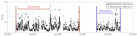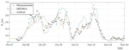 Figure 10 shows the accuracy of the ANNs and MEDSEA reanalysis wave data with respect to the measured significant wave heights outside the training period from 8 August 2008 to 15 November 2008 (limits shown with blue vertical lines in Figure 2).