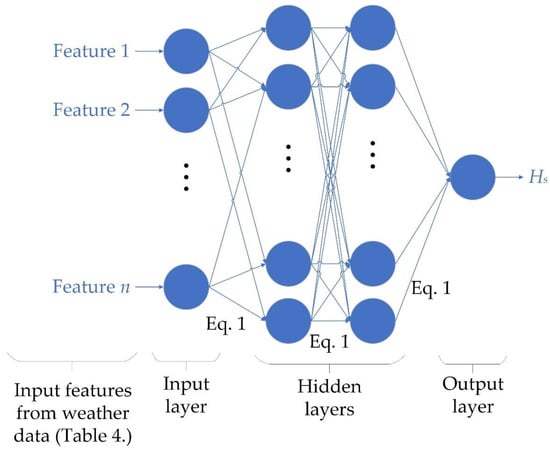 The ANN model itself (gray rectangle in Figure 3) is a regular multilayer feed-forward network, which is commonly used to fit non-linear functions that relate the input data (wind data from ISD, as described in Section 2.2) to the response data (measured wave data, as described in Section 2.2) []. Each node (blue circle in Figure 4) passes information, starting from the input layer to the next layer until the output layer []. An ANN usually consists of nodes arranged in an input, multiple hidden layers, and an output layer (Figure 4). In this paper, the output layer consists of only one node corresponding to the significant wave height.