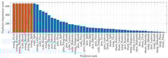 Feature selection consists of determining a subset of input features from all existing features that show a high explanatory power. In this paper, the F-test was conducted to perform the feature selection. If the F-test results in a small p-value, then the feature is significant. Subsequently, all predictors in the ISD dataset were ranked according to their significance (Figure 5), with the results presented as the negative logarithm of the p-value (−log(p)). When a p-value is close to zero, the output would be Inf. Therefore, the features that had an Inf score were colored orange instead of blue and scaled to the largest non-Inf score that was blue. Overall, a higher score value in Figure 5 means that the corresponding predictor is more important.