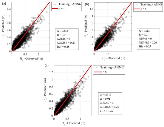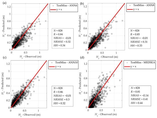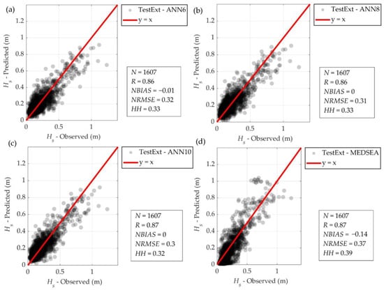 The correct wave buoy data points were moderately underpredicted (14%) by the MEDSEA reanalysis (Figure 8). MEDSEA predominantly underpredicted the smaller observed significant wave heights Hs < 0.25 m, while it mostly overpredicted the higher significant wave heights Hs > 0.5 m. On the other hand, every ANN showed minor underprediction (−1% for ANN6, ANN8 and ANN10).