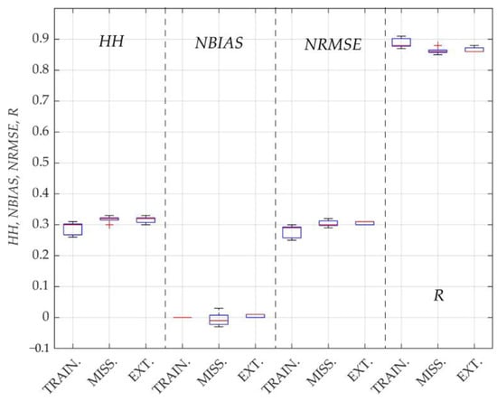 We repeated the random separation of the training set and the test set labeled as ‘missing’ (described in detail in Section 2.3) 10 times to observe the sensitivity of the accuracy of the model ANN to the random separation. This was tested with the ANN10 model, and the results generally showed low sensitivity (Figure 7). The sensitivity to random separation was higher for the training sets with larger standard deviations than for the two test sets, except for the NBIAS, where the situation was reversed. The mean HH and NRMSE indices were slightly higher in the test sets than in the training sets, while the R index was slightly lower than in the training sets, both of which were to be expected.