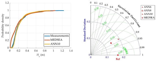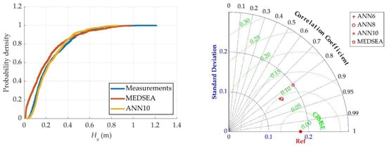 The empirical Cumulative Distribution Functions (CDFs) in Figure 9 (left) again show better agreement between the wave data reconstructed by ANN10 and the correct (measured) significant wave heights. The CDF for MEDSEA shows a higher probability density for significant wave heights below 0.4 m, with the curves intersecting at 0.5 m and showing a lower probability density thereafter. The high probability density of the MEDSEA CDF is due to a strong underprediction of low significant wave heights (Hs < 0.4 m) also observed in Figure 8d. On the other hand, the CDF of ANN10 shows greater agreement with measurements for the entire range of significant wave heights. Both MEDSEA and ANN10 CDF fall short of the highest observed significant wave height, indicating underprediction in the highest observed value. The Taylor diagram in Figure 9 (right) again shows that the accuracy of the ANN models (ANN6, ANN8 and ANN10) are very similar, while still showing superior accuracy as opposed to the state-of-the-art reanalysis wave model, MEDSEA.