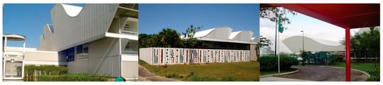 The most common examples of these devices are the so-called “saw tooth”, whose shape is orthogonal and without many variations (Figure 1). In Brazil, the work of the architect João Filgueiras Lima, also known as Lelé, stands out, whose shed roof air extractors and collectors are in most of his designs and with different aerodynamic geometries (Figure 2), seeking to improve natural ventilation and lighting. The concern with the format of these devices is important because for Hoof et al. (2011), one of the main parameters that influence natural ventilation is the building’s geometry. Internationally, studies have been developed for orthogonal shaped sheds [,,,,,,]. Few studies address these devices with aerodynamic shapes [,], with a significant part being developed by the authors of this article.