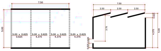 First, the reference case was defined, which will be the basis for the analysis of the different design parameters. The characteristics of the buildings designed by Lelé were used to define this case, because he is known worldwide for the use of sheds to promote natural ventilation and because the most of his buildings are located in regions with hot and humid climates []. The geometry of the shed in the reference case has an orthogonal shape, as it is the format used in most standard buildings with shed roofs (Figure 3). The focus was to analyze the influence of different design parameters on the performance of the shed roof air extractors and collectors. However, the importance of evaluating, in future research, the insertion of protectors in the openings to avoid the incidence of direct solar radiation and the entry of undesirable elements (such as rain), is emphasized.