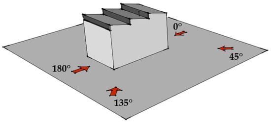 The sheds were evaluated as extractors (0° and 45°) and collectors (135° and 180°) (Figure 4), analyzing the effect of natural ventilation by the action of the winds. The 90° direction has been previously analyzed and has significantly reduced natural ventilation performance. Changing the design parameters did not cause an increase in the speed of the indoor air [] and, therefore, this direction was not analyzed in the article.