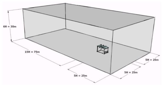 For this step, software based on the Computational Fluid Dynamics (CFD) CFX 12.0, Ansys was used. The computational simulations were validated through wind tunnel tests in National Civil Engineering Laboratory—LNEC, Lisbon. The results were published in Lukiantchuki, et al., (2018) [] and Lukiantchuki, et al., (2019) []. The sizes of the rectangular domain followed the recommendations of and Tominaga et al. (2008) []: distances to windward and on the sides = 5 H (25 m); height = 6 H (30 m); distance to leeward = 15 H (75 m), H = 5 m corresponding to the height of the simulated model (Figure 5).