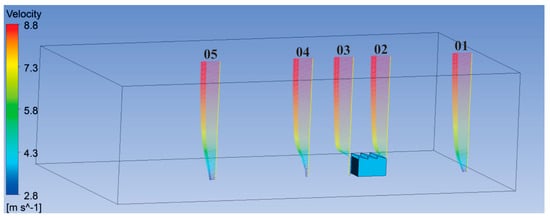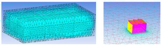 The area of obstruction of the building in the domain was a maximum of 1.5% in the direction perpendicular to the flow, following the suggestion of Cost (2004) [] and Tominaga et al. (2008) []. Thus, the blocking effect is avoided, preventing the domain boundaries from influencing the flow.