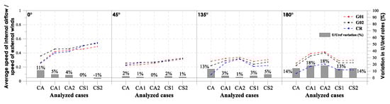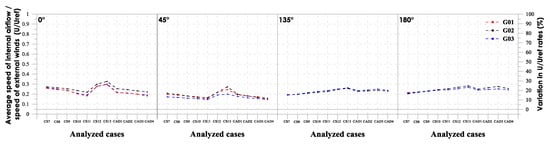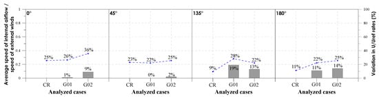 Figure 9 shows the use of external wind in the internal environment (U/Uref) for the cases of group 2, for the shed roof air extractors and collectors. Then, Table 6 gathers the design guidelines, regarding the size parameter of the air inlet and outlet openings, for the same situations.