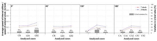 Percentage of utilization of the average speed of the indoor airflow as a function of the speed of the external winds (U/Uref) for group 3: opening, distance and alignment of the sheds.