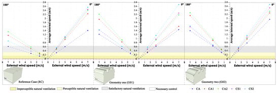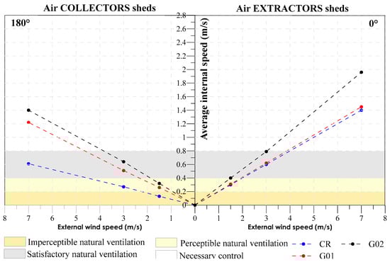 Figure 12, Figure 13 and Figure 14 show the average air velocity in the internal environment for the cases of groups 1, 2 and 3, respectively, indicating the limits of acceptability of the indoor air velocity in relation to the velocity of the external winds (m/s), for the shed roof air extractors and collectors.