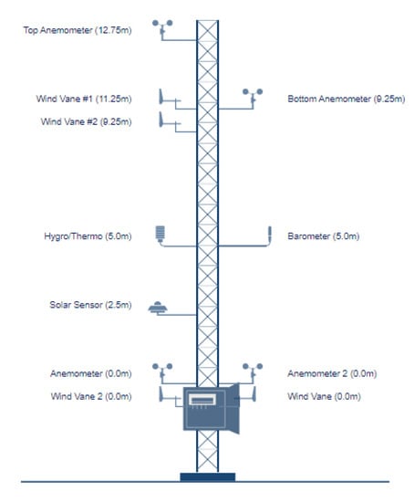 All the sensors or measuring devices are connected to a data acquisition system (Model: Meteo-40L, manufactured by Ammonit (Ammonit Measurement GmbH, Berlin, Germany) or data logger, in which the data are continuously collected at a sampling rate of or higher. Each sensor measures and records its relevant reading once in a minute or less, and for every 10 min, the data logger saves the minimum, maximum, mean, and standard deviation of the set of measurements. It is worth mentioning that the analysis depended on retrieved data that belongs to the anemometer and wind vane set at a height of . Figure 3 and Figure 4 show a schematic diagram and picture of the wind mast station within the NERC premises.