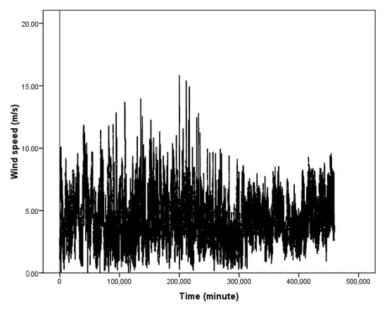 Filtering is the process of defining, identifying, and fixing data flaws to lessen their effect []. In the restored readings from the mast data logger, we discovered error codes in the form of negative wind speeds, which were successively removed, leaving behind blank spaces or empty data fields. Figure 5 displays the ten-minute interval time series graph between 18 March 2017 and 30 January 2018, and Figure 6 illustrates the same data as a frequency histogram that includes the normal curve.