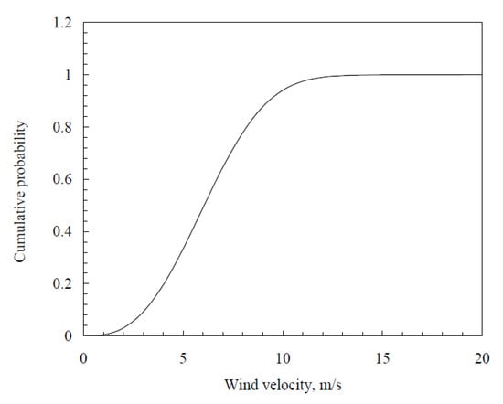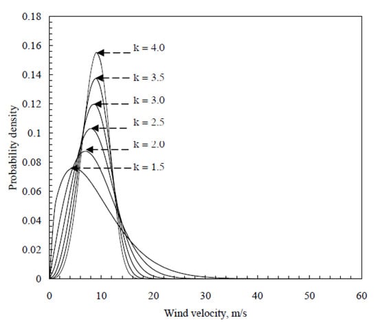 The two-parameter Weibull distribution best fits the wind speed data []. The probability density function of this distribution is given in Equation (1), the cumulative density function is provided in Equation (2) [,], and the mean and the variance are given in Equations (3) and (4), respectively []. Figure 7 and Figure 8 show graphs of the typical Weibull density functions [].