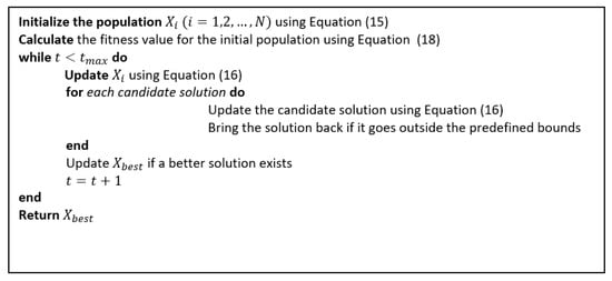 The Firefly optimization algorithm (FA) introduced by [,] is a swarm-intelligence methodology that takes the Firefly position as the candidate solution. The Firefly brightness, the fitness value, is utilized by the algorithm to define the relationship between the fireflies, as the brighter ones are attractive, and the distance between them and the less-glowing fireflies is shortened. The primary benefits of the FA include the automated separation of the entire population into subgroups, the innate ability to handle multi-modal optimization, and the high ergodicity and diversity of the solutions. []. Equations (15)–(17) are the backbone equations for this artificial intelligence technique, while Figure 9 shows the algorithm pseudo-code.