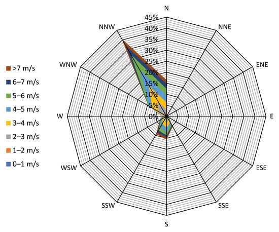 Finally, the frequency percentage data in Table 6, which corresponds to the wind direction, indicates that the wind primarily blows from the north, which is again noticeable in the rose diagram in Figure 16. The wind direction illustrated in the rose diagram precisely simulates reality according to our on-field remarks that we have noticed monitoring our currently operating 2 kWp wind turbine recently installed at the NERC campus.