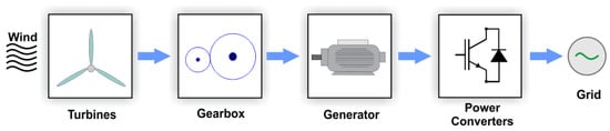 The function of a wind energy conversion system is to transform the kinetic energy of the wind (captured through wind turbines) into electrical energy to be injected into the electrical grid, as shown in Figure 2. In this work, emphasis was given to the electrical subsystem, more specifically to the power electronic converter (multilevel converter) and the electric generator (Squirrel Cage Induction Generator—SCIG). Power converters are responsible for making this energy flow effective and reliable [26,27].