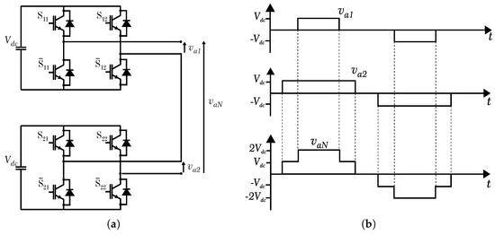CHB multilevel converter. (a) Structure of five-level CHB multilevel converter. (b) Waveforms of the output voltage of the individual H-bridges ( and ) and the CHB arrangement ().