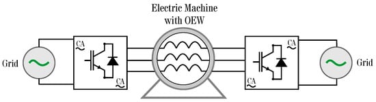 Operating the machine with OEW, it helps to obtain high voltage levels in high power applications [15]. In this type of drive, the machine windings are neither star- nor delta-connected, as in a traditional drive but, instead, the six machine terminals are connected by different converters at each end of the windings [21]. In Figure 4, a general schematic of an electric machine drive with open-end windings is shown.