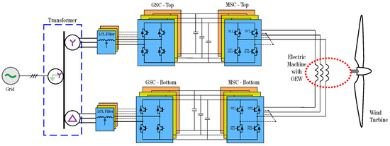 As previously mentioned, by increasing the power of wind turbines, conventional converters operate at their electrical limits. Multilevel converters and machine drives with OEW are employed to reduce the individual power of the converters, also increasing the voltage level of the arrangement [29].