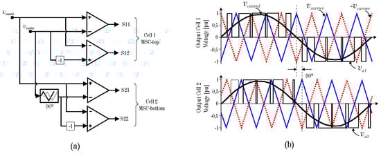 In order to achieve the lowest possible harmonic distortion in the output, the phase shift between the carriers of adjacent cells (top and bottom cells) must be or for the CHB and FC converters, respectively, where n is the number of converter cells. Based on Figure 5, the cells of each phase—on the MSC side—will be modulated by PS-PWM and the phase shift between the carriers of the top cells (top) and those of the bottom cells (bottom) is [6].