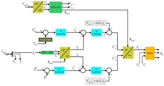 The variables shown in Figure 9 are: is the sum of filter inductances; are the grid phase currents; is the voltage grid; and are the grid voltage in the synchronous reference frame; is the grid angular frequency; and Q are reactive power reference and measured reactive power, respectively; and finally, and are the dc-link voltage reference and measured dc-link voltage, respectively.