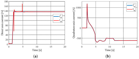 Machine side-converter currents, where and are the direct and quadrature current reference; and are the measured value. (a) Direct axis component. (b) Quadrature axis component.