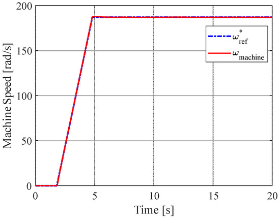 Figure 8 shows the MSC control loops; as noted, the direct axis current reference (, Equation (16)) is calculated from the machine flux (). Given that the machine flux has stabilized, the flux value will remain constant as long as the system remains below the rated speed. The current required to maintain this flux is: