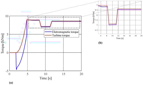Turbine and machine electromagnetic torques. (a) Behavior of torques throughout the simulation. (b) Detail, zoomed in, showing abrupt variation in wind speed, reflecting on turbine torque and, consequently, on electromagnetic torque.