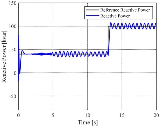 The same analysis can be performed in terms of the reactive power supplied to the grid. Figure 15 shows the behavior of the reactive power control loop, phase A, when a step is applied to the power reference. By analyzing the response to step variation in reactive power, it is possible to verify that the rise time is approximately 0.18 s with an overshoot of . The oscillation seen at the output of the converter was again due to the single phase connection of each converter. Considering all converters, this oscillation was in the range of in relation to the reference reactive power. All other reactive powers delivered by the converters presented the same behavior, and will not be shown.