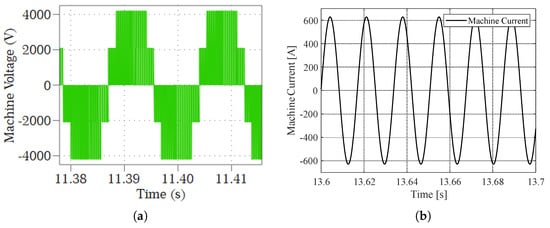 Figure 16a shows the voltage synthesized at the terminals of the induction machine due to the operation of the converters. As seen, the synthesized voltage was five-level, with a peak value equal to 4200 V (). The semiconductors employed in each converter need to support (2100 V), instead of (4200 V), therefore the IGBT blocking voltage can be 3300 V, as stated previously. In the same way, Figure 16b presents the current at the machine terminals.
