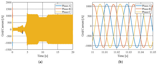 Figure 17a shows the behavior of the grid currents and the consequences of variations in machine torque and power can be seen in the behavior of the currents. Furthermore, the graph shown in Figure 17b shows, in detail, the grid currents, which have a sinusoidal waveform with small harmonic distortion.