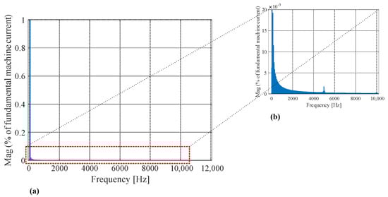 Harmonic spectrum of machine current. (a) Overview of the harmonic content of currents at the machine terminals. (b) Detail, in zoom, showing the low harmonic content in currents of the machine.