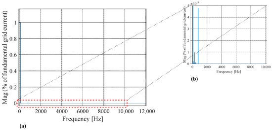 Harmonic spectrum of grid current. (a) Overview of the harmonic content of the currents at the grid. (b) Detail, zoomed in, showing the lowest harmonic content in currents flowing in the grid.
