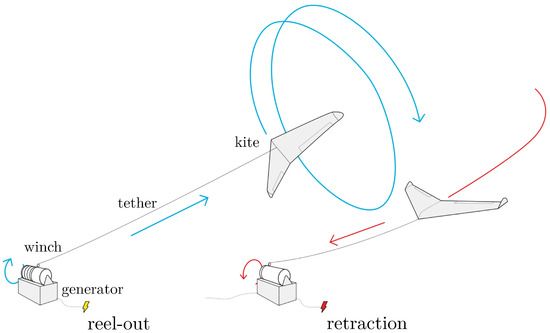 Figure 1 illustrates the operation of such a system, which consists of three distinct phases. During the traction (reel-out) phase, the kite flies in repeating patterns while reeling out the tethers from a winch connected to a generator and thus generating electrical energy. Figure-eight and circular trajectories are most common here, both resulting in the same performance under the same boundary conditions [7]. Systems relying on multiple tethers usually operate using figure-eight patterns to avoid twisting. At the end of the traction phase, the kite has to be retracted. To keep the energy consumed during the retraction phase to a minimum, two main approaches exist [8]. While soft kites are usually brought to an elevation of close to 90 to retract without crosswind motion, rigid wings can be pitched down to low or negative angles of attack to more rapidly retract. The third phase is take-off and landing of the kite. A comprehensive summary of different approaches for rigid wings and soft kites can be found in [8], while an excellent overview of the general operation of different AWE systems is given in [9].