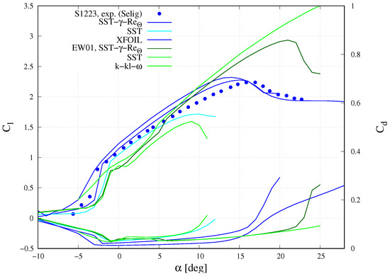 Experimental and simulation data for S1223 and EW01 will be presented and compared in the following section. The lift measurements presented were obtained via force measurements, while the drag data originate from the pressure measurements in the wake. Experimental drag data are therefore only shown for angles of attack lower than that of .