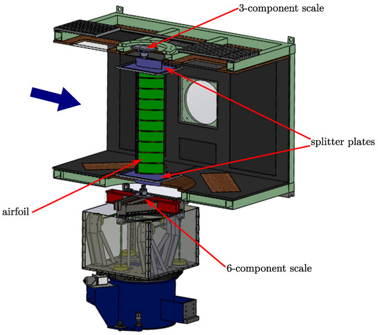 Lift forces were measured using an external rotating 6-component scale at the bottom and an external 3-component scale at the top of the model airfoil. The 6-component scale is connected to the model via a multi-plate clutch and has a maximum range of 2.2 kN. The 3-component scale at the top of the wind tunnel is an ME-Messysteme K3D120 with a nominal Range of 500 N. It is connected to the model torque-free via spherical roller bearings. Both scales have a maximum error of of the respective full scale.