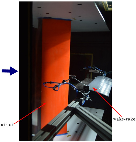 To measure the airfoil drag, pressure measurements were conducted downstream of the model using a wake-rake with 58 pressure tubes (see Figure 8). The pressure tubes were distributed over a total length of 500 mm, with distances between the tubes varying from 4 mm to 16 mm (higher resolution in the middle). The tubes were 100 mm long with inner and outer diameters of = 1 mm and = 1.6 mm.
