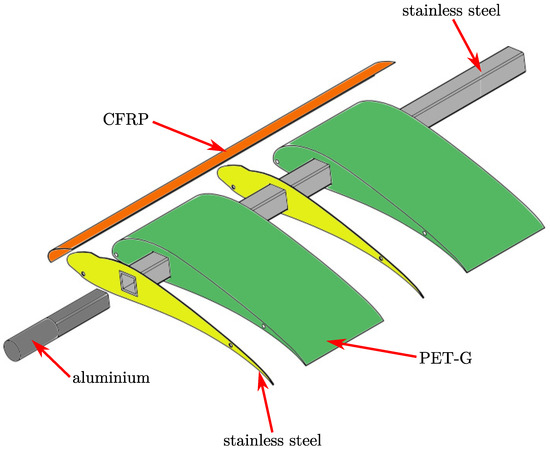 The principal construction is shown in Figure 9. The model mainly consists of 119 mm spanning, 3D-printed plastic (PET-G) segments, manufactured using the FDM method. The segments were mounted on a stainless steel profile with a square cross section. In between the segments, 1 mm thick laser-cut stainless steel sheets were placed to provide additional stiffness. Airfoil segments and steel sheets were fixed in place by two metal bolts and glued together. For airfoil and slat configurations, a thin CFRP slat was glued to the steel sheets. The models consist of ten airfoil segments with a total chord length of c = 300 mm, resulting in a span of s = 1200 mm and an aspect ratio of = 4. After assembly, the models were sanded, primed and painted to provide a smooth surface.