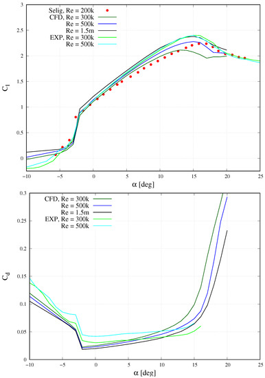 Experimental and numerical lift and drag coefficients over the angle of attack are shown in Figure 10 for and , as well as simulation data for , which was the design Reynolds number for the optimised slat and airfoil geometry. Additionally, the lift coefficients measured by Selig and Guglielmo [12] at are shown for reference.