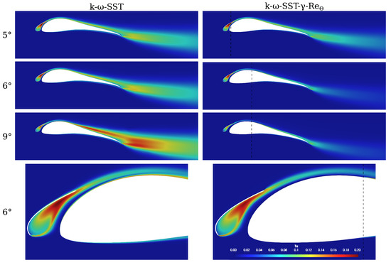 Figure 12 shows the turbulence intensity for simulations with and without - transition model (see Figure 6) at critical angles of attack. For the - model, the approximate point of transition of the boundary layer on the main airfoil is marked with a dashed line. The sudden increase in lift and decrease in drag between and seems to be caused by a downstream jump of the transition point between those angles of attack. Consequently, the size of the area with small scale separation on the rear of the airfoil decreases, starting at . This shift could not be predicted by the pure k--SST model and therefore leads to an increasingly separated flow on the rear part of the airfoil for increasing . While at low angles of attack the predictions are roughly in agreement, the thicker and more developed turbulent boundary layer here does not withstand the adverse pressure gradient as well as the transitioned one and hence leads to vast separated areas for .