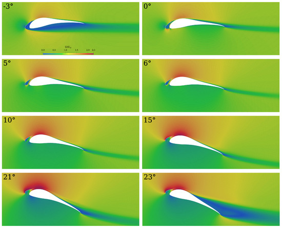The velocity field at (black graph in Figure 11) for selected angles of attack is illustrated in Figure 13. The upper end of until which the airfoil is in full pressure side stall is marked by , which is a desirable state for efficient retraction of an AWE wing. The flow then rapidly attaches and exhibits a large separated area between slat and airfoil, as well as high velocities near the main airfoil leading edge (see ); both steadily decrease with increasing . The effects of the shift of the transition point between and described earlier can clearly be observed by the more attached flow at the rear part of the airfoil suction side from onwards. The separated area at the slat pressure side is decreasing further, but is still observable at the angle of attack the optimisations were run at (). The flow stays mostly attached until and then starts to separate, starting from the trailing edge. Since only steady state RANS simulations were run and hence simulation data after stall should be taken with a grain of salt, it can be assumed that the consequent drop in lift happens much more gradually than might be expected based on the concave shape of the suction side of the main airfoil. The experimental data (see Figure 11) support this assumption.