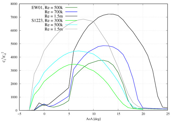 Compared to S1223, being the optimisation starting point, the maximum at the design Reynolds number of could be increased significantly (by about 0.6), which is an improvement that one should expect when adding a slat to an airfoil. Figure 14 shows a comparison of power factors, which was the second optimisation objective, calculated from the simulation data. Even though the maximum power factor could only be increased for higher Reynolds number, the main benefit here is the shift of high power factors to larger angles of attack and therefore regions of higher lift. For AWE wings, this potentially means a higher absolute traction force at the point of maximum and therefore increased yield. Furthermore, the higher lift allows to compensate for additional drag forces, e.g. caused by three-dimensional effects or tether drag, when considering the power factor for the whole system. Additionally, the glide ratio drops to lower values significantly earlier when decreasing the angle of attack (starting at ), potentially reducing the amount of energy required during the retraction phase.