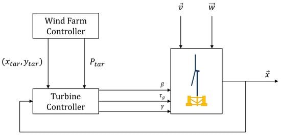As indicated in the block diagram of Figure 2, each FOWT will receive a reference or a target position and power from a wind farm controller. Then, the controller related to each FOWT needs to satisfy those targets. Specifically, the control objectives of the FOWT controller consist of: