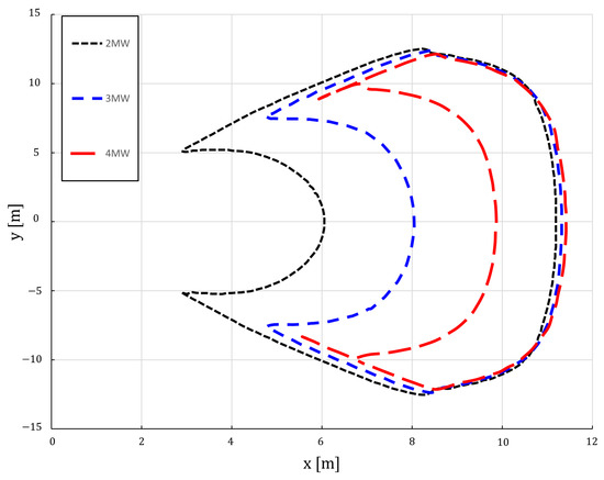One key consideration that needs to be integrated, to ensure the proper functioning of the FOWT and its controller, is the concept of movable range [40]. Specifically, it indicates the permissible region (in terms of and coordinates) where the constraints of power, generator speed and torque are satisfied. For example, Figure 3 shows the movable range with different power targets under a constant wind speed . It can be concluded that the movable range increases with low power requirements.