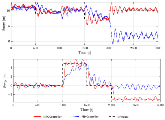 The time series results (surge and sway) for both the MPC and PID controllers are shown in Figure 6. As can be concluded, the MPC outperforms the PID controller in tracking the target position. Actually, the PID was not even able to get to the 5th target position. This can be attributed to the inherent limitations of the PID controller which cannot perfectly control the position while maintaining a reasonable rotor speed for all scenarios (in this case for negative sway targets). In fact, the PID parameters could be potentially further tuned to achieve the 5th target position but it might not be suitable for other target locations. System instabilities have also been reported for PID controllers when they were made more aggressive [20] to achieve similar control objectives of this study. In addition, PIDs are based on the single-input-single-output principle and cannot handle system constraints which makes them difficult to control a constrained system with coupled inputs (usually several PIDs are integrated with each one of them being independent of the other).