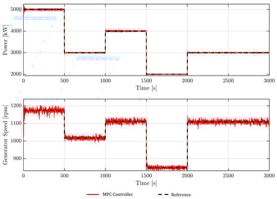 Time response of the FOWT power (top) and generator speed (bottom) using the MPC controller.